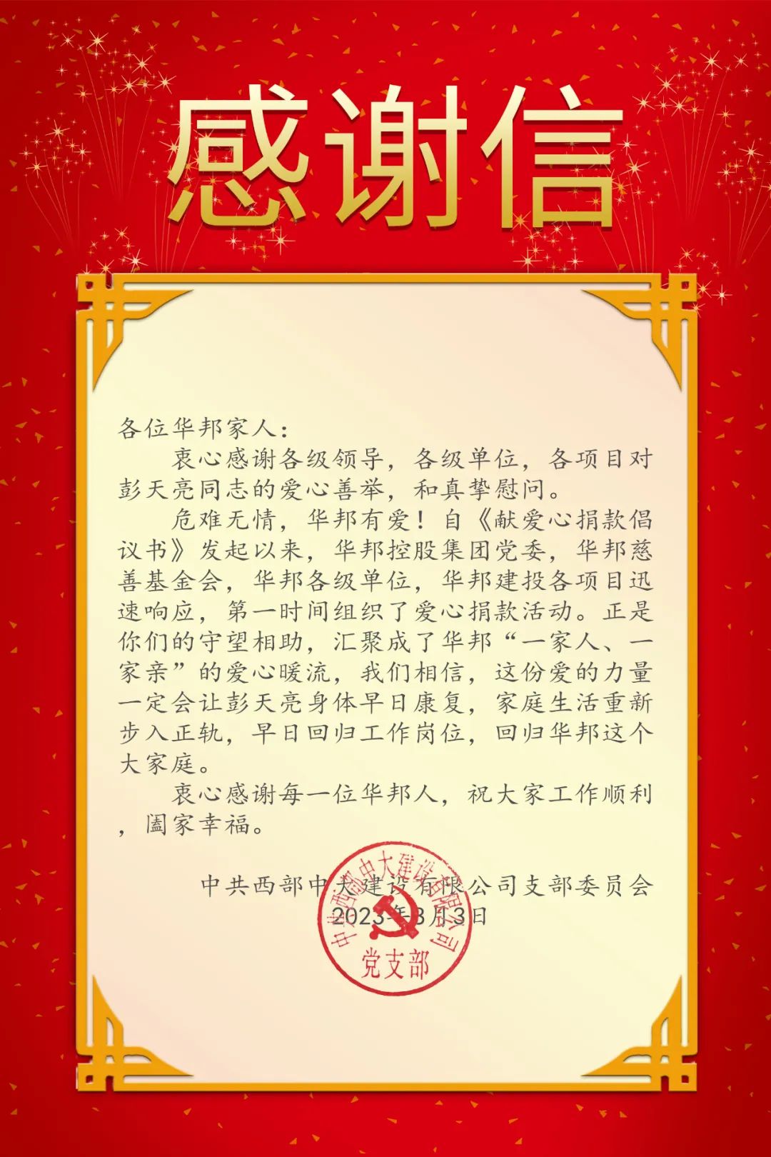 点滴爱心汇聚大爱暖流,获悉彭天亮的情况后,华邦所属各业务板块、项目部积极响应,纷纷组织爱心捐款,大家都希望通过实际行动,伸出援助之手,给彭天亮一家带去一点力所能及的帮助。