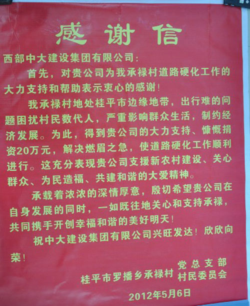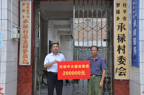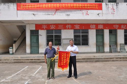 7月12日中午,受集团公司董事长委托,桂来高速总承包部常务副总经理黄振成和综合办公室主任冯利刚赶往距离桂平市区60余公里的罗播乡承禄村,为村里送去了20万元的捐款,资助当地的农村道路建设。