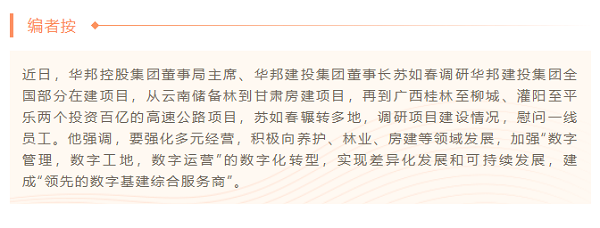6月14日-15日,端午节期间,苏如春来到由伟德体育官方网站集团投资承建的广西桂林至柳城高速公路项目(概算总投资129亿元,BOT模式)、灌阳至平乐高速公路项目(概算总投资136.42亿元,PPP模式)调研,看望奋战在一线的伟德体育官方网站员工,并向端午节仍坚守岗位的一线员工表示慰问。他强调,要强化多元经营,积极向养护、林业、房建等领域发展,加强“数字管理,数字工地,数字运营”的数字化转型,实现差异化发展和可持续发展,建成“领先的数字基建综合服务商”。