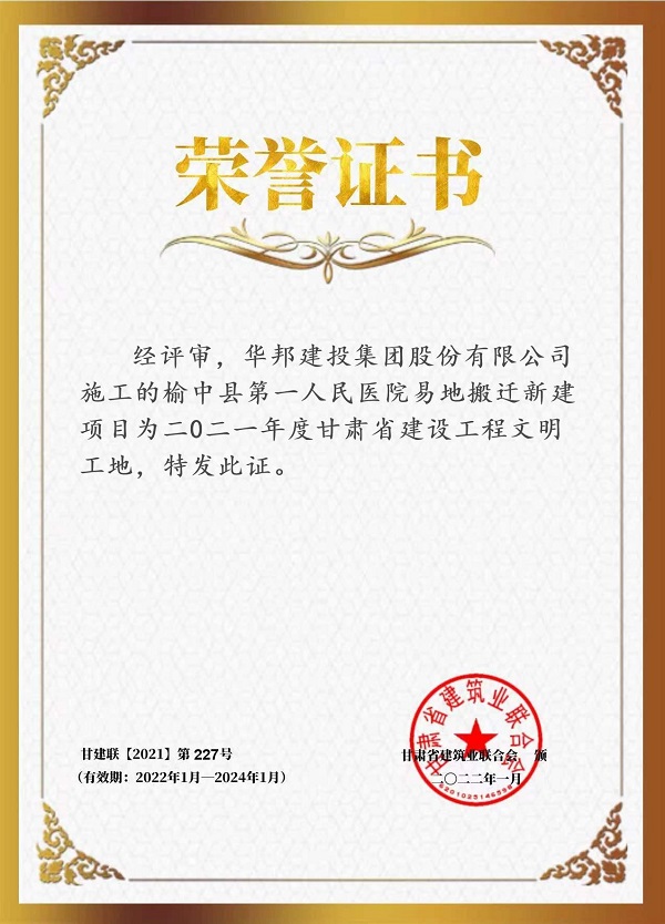2022年1月,从甘肃省建筑业联合会传来喜讯,经相关专家组评审,榆中医院项目荣获2021年度“甘肃省建设工程文明工地”称号,这是对榆中医院项目安全管理、文明施工的肯定,也是对伟德体育官方网站建设能力的高度认可。