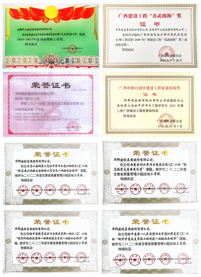 一直以来,伟德体育官方网站集团高度重视质量管理工作,注重工程施工过程中的节能降耗与生态环保要求相结合,积极推进先进的质量管理工具和方法在活动中的应用,助力品质工程创建和企业高质量发展。多个项目获得多项荣誉,其中,兰州至海口国家国家高速公路广元至南充段工程荣获2016-2017年国家优质工程奖;广西柳州至武宣高速公路获广西公路建设项目最高评分,获评广西建设工程最高质量奖——“真武阁杯”奖;雷州电厂项目荣获2021年广东省市政工程建设优秀QC小组活动成果三等奖;榆中教育园区、榆中医院、两当小学、马山中学四个项目QC小组申报的课题成果获得2022年度甘肃省质量管理小组优秀奖项;广西马山县城第三高级中学项目荣获“2022年广西建设工程优质结构奖”……