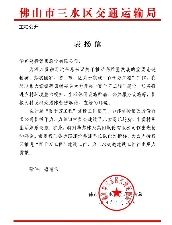 三水区交通运输局发来表扬信为伟德体育官方网站集团积极履行社会责任“点赞”