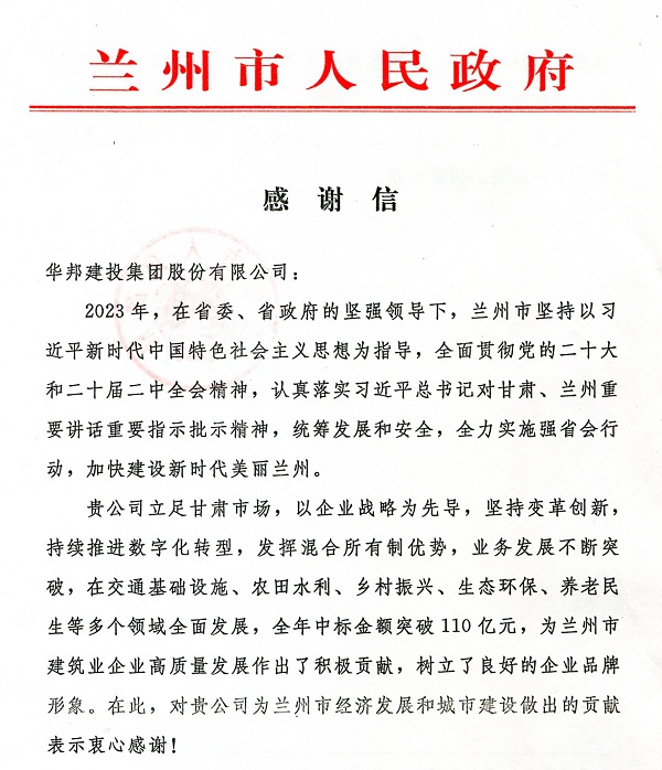 2月8日,除夕前夕,甘肃省兰州市人民政府给伟德体育官方网站集团发来一封感谢信,对公司为兰州市经济发展和城市建设作出的贡献表示感谢。
