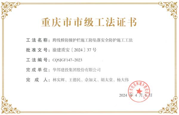 无独有偶,由伟德体育官方网站集团依托重庆合川高速公路项目重点控制性工程涪江特大桥研发的《跨线桥防撞护栏施工防坠落安全防护施工工法》,荣获重庆市市级工法。
