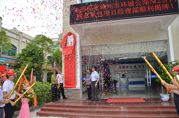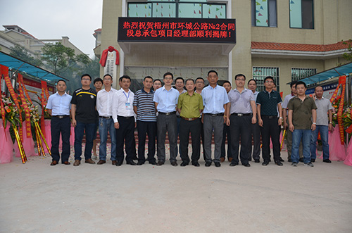 监理单位、建设单和集团公司领导在仪式上的积极发言,充分体现了梧州环城公路工程№2合同段项目部在前期准备阶段取得的成果。11时30分,在隆重的掌声和礼炮声中,集团公司副总裁唐勇、广西宏梧高速公路有限公司党委副书记、纪委书记李宏、育才布朗交通咨询监理有限公司梧州环城项目总监理工程师李学锋、项目经理曾联金在分别代表各级各单位为项目经理部隆重揭牌。揭牌仪式的顺利举行预示着梧州环城公路工程项目进入实质性实施阶段,具有里程碑意义。目前,各工区驻地建设正在如火如荼进行,项目部将在各级各单位的关心和支持下,积极开展各项工作,力争早日掀起施工大干高潮。