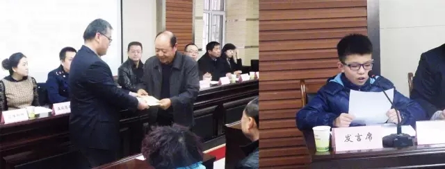 受助学生家长代表接受捐助(左图),受助学生代表做感谢发言(右图)