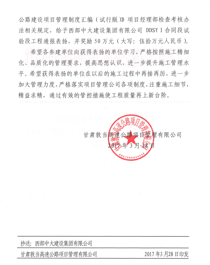 3月28日,敦当项目收到项目办下发的《关于对西部中大建设集团有限公司DDSYI合同段给予试验段工程通报表扬的决定》。“文件”对敦当高速公路建设项目取得的成绩进行了通报表扬,并奖励人民币50万元。