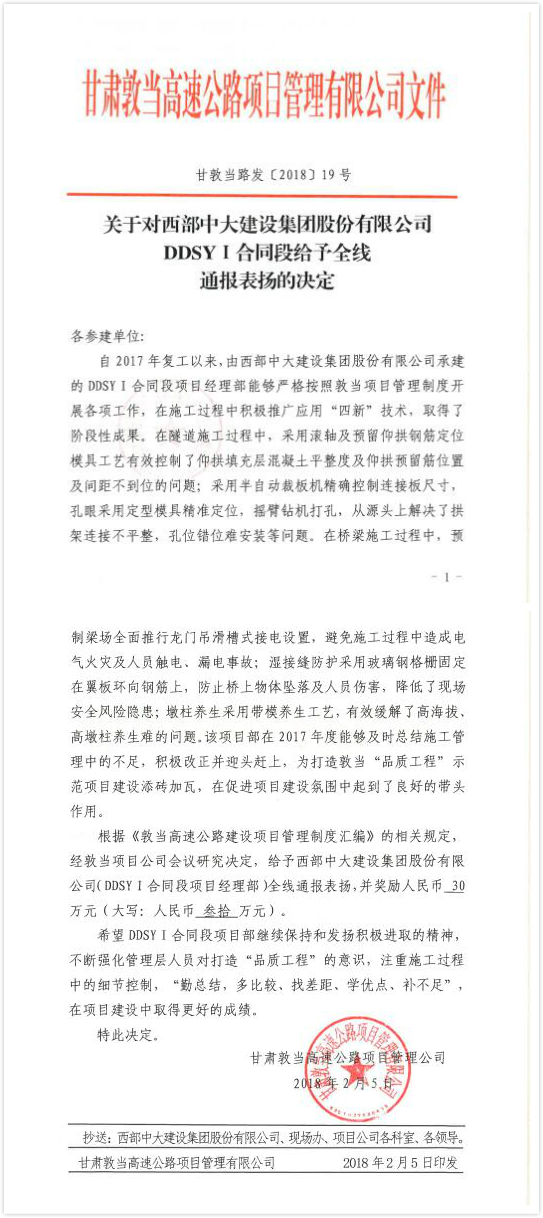 由西部中大建设集团承建的DDSY1(敦煌至当金山)项目自开工以来,积极发扬“工匠精神”,响应和执行项目公司、集团公司打造“品质工程”要求,始终把施工质量控制和标准化施工作为施工管理重点,技术和工艺、设备方面积极创新,工序上严格执行“三检制”,多次受到业主和主管部门表彰奖励。2018年2月5日,DDSY1项目再传喜讯,项目公司对项目在施工中积极推广应用“四新”技术,为打造敦当“品质工程”起到了良好的带头作用,特别给予全线通报表扬和奖金奖励。