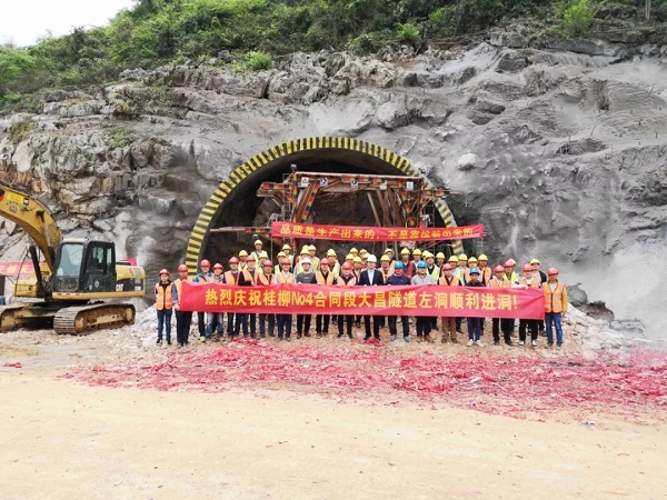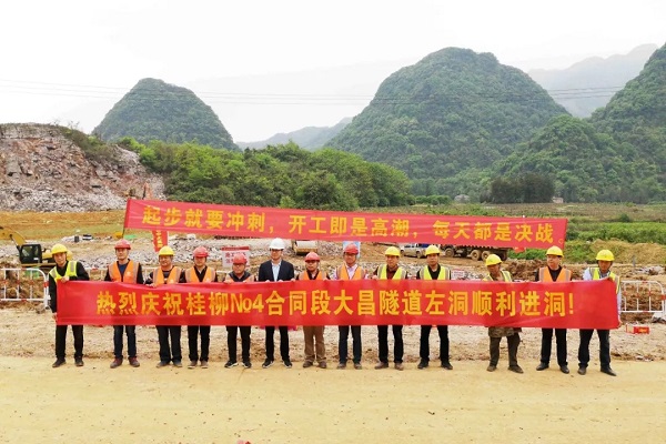 暖春四月阳光灿烂,彩旗招展。4月10日上午10点,伴随着震耳欲聋的鞭炮声和机器的轰鸣声,桂林至柳城高速№4项目经理部大昌隧道左线出口端顺利进洞,标志着大昌隧道正式进入主体工程施工阶段。