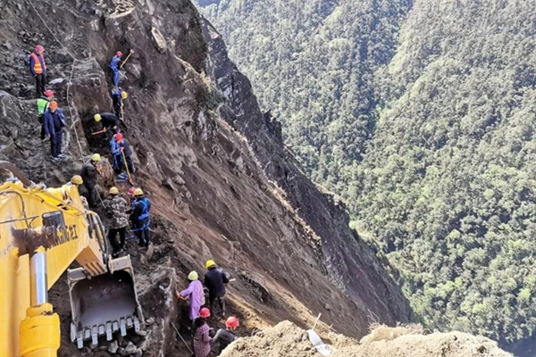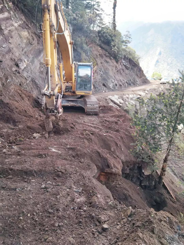 一旦出现塌地质灾害,项目部高度重视,立即安排工作组赴现场指挥、采取多措施部署道路抢修保通工作,如针对石方爆破施工导致道路断通影响哨所后勤物资供给问题,项目部无偿提供人员、机械、车辆,配合连队进行物资倒运,确保军方后勤物资得到保障;为避免再次因石方爆破而导致道路中断的情况出现,在相应的路段取消原制定的火工品爆破方案,改用大型机械破碎工艺开挖石方,分段平行作业施工;在石方爆破阻断交通的问题,项目部立即安排机械清理石方,抢通道路。