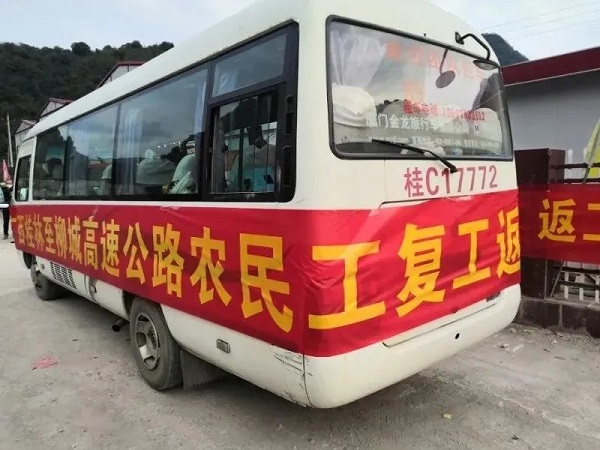 2月24日清晨,春风和煦,阳光明媚。在广西壮族自治区桂林市全州县,11名工人在接受体检和防疫宣贯教育,填好《复工人员一人一档信息登记表》后,登上返岗大巴,踏上远行旅程。他们此行目的地是200公里外的桂柳三标项目部驻地百寿镇,不出差错,4个小时后,他们将重返施工工地,开始一年的工作。