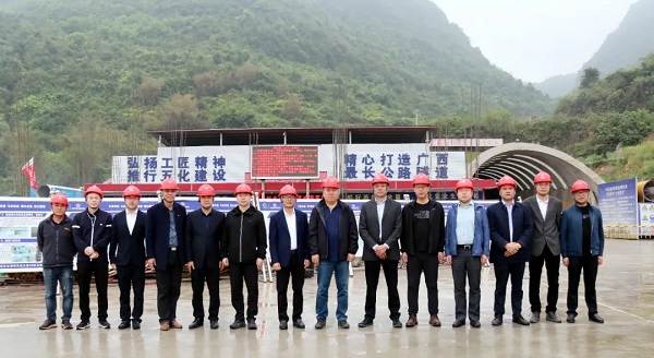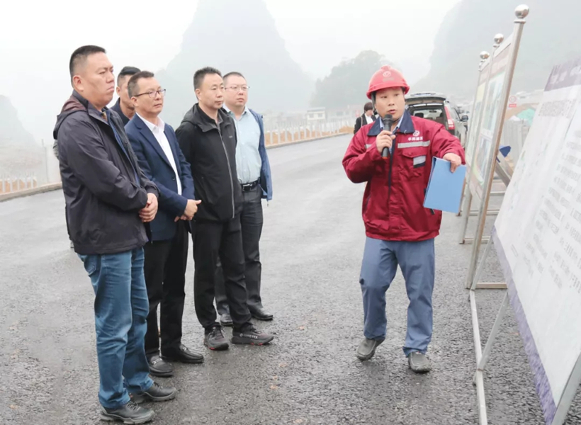 沈金生一行调研了桂柳高速泗顶互通区、桂柳路面、永福屯隧道等施工现场,查看了路基、路面、隧道施工,听取了相关人员对安全生产、施工亮点、安全技术等介绍。