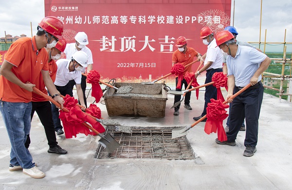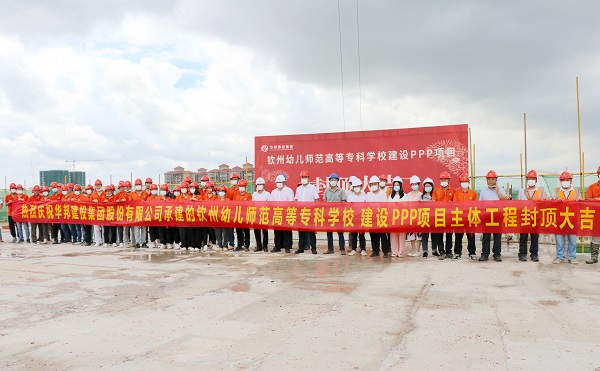 7月15日,由伟德体育官方网站集团承建的广西钦州幼儿师范高等专科学校建设PPP项目(以下简称:钦州幼专项目)学前初等综合楼、13#和15#宿舍楼主体工程封顶,标志着项目建设取得阶段性成果。钦州幼专学校规划处处长黄传良,华盛育才公司、监理公司及钦州幼专项目等人员参加封顶仪式。