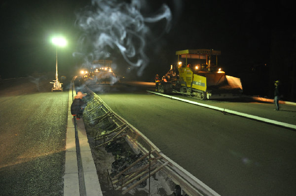 按计划,桂来高速定于9月28日实现局部通车目标,凤凰山爆破段施工点工程量依然较大、沥青上面层施工未及时跟上,交安绿化、房建等配套工程施工进度还需进一步加快施工进度。结合现状,桂来总包部统筹安排,及时调整工作思路,集中力量对凤凰山施工点进行最后的冲刺施工,派专人驻守施工现场,加大机械设备和施工人员投入,24小时不间断施工,取得了较好的成果。路面上面层施工通过前期的技术优化后,在各级领导的支持和共同努力下,目前已正常铺设,全线多点同时作业, 24小时不间断摊铺。
