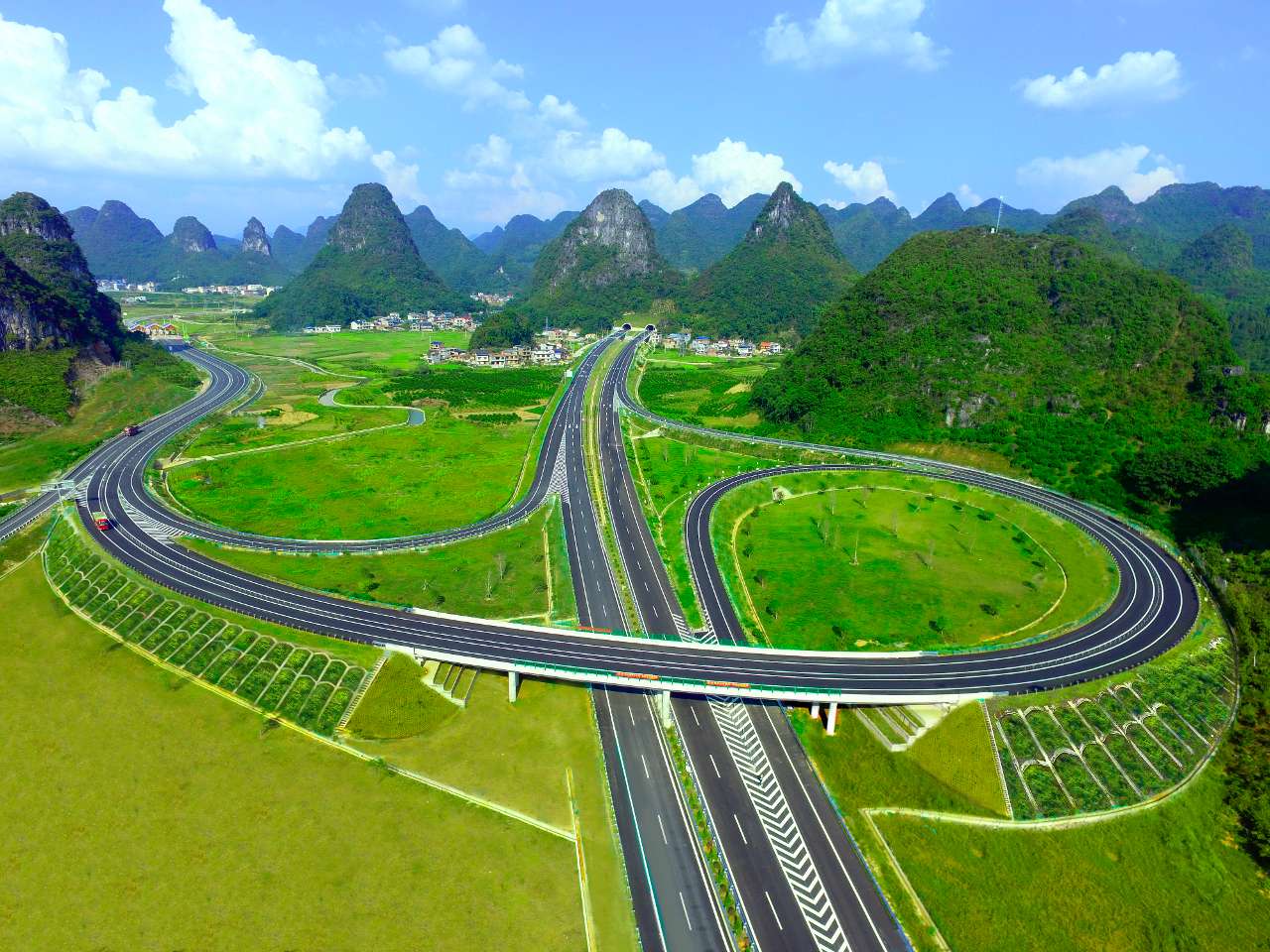 新桂柳高速公路还充分融入沿线风土民俗和地域特色,提升路域景观文化。在大坪隧道、古毫等隧道洞门墙,彩绘的民族风情元素随处可见。浓郁的民族特色文化设计,加上沿线浑然天成的喀斯特地貌,让司乘人员真切感受到“车在路上行,人在画中游”的美好体验。