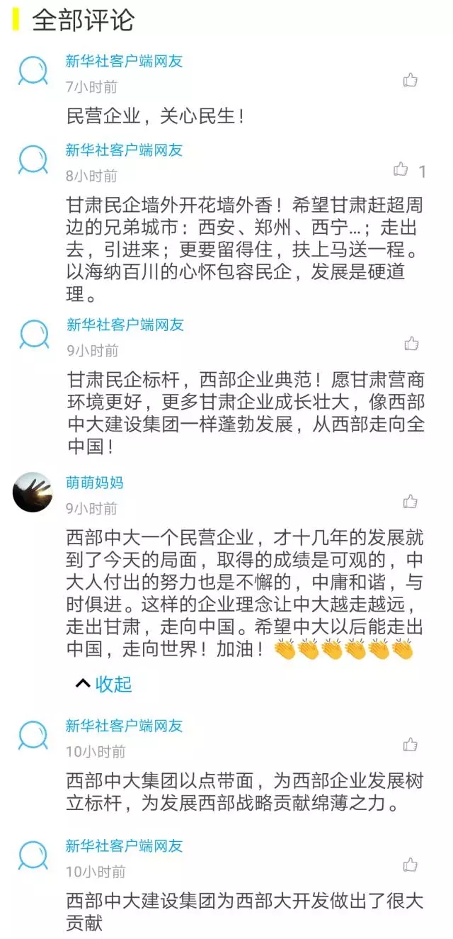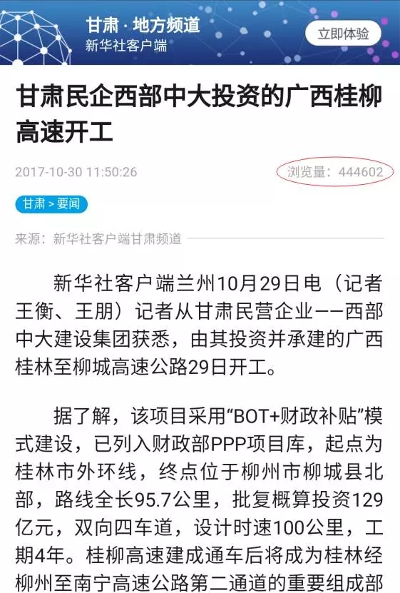 十九大报告中指出,“坚持在发展中保障和改善民生,增进民生福祉是发展的根本目的”。在积极推进国家民生工程发展征途中,西部中大建设集团现已形成以西部为中心,辐射新疆、西藏、陕西、广西、广东、四川、重庆等十余省市自治区的发展战略布局。 近年来,西部中大建设集团相继投资建设了桂平至来宾高速公路(投资46亿元,2014年通车)、柳州至武宣高速公路(投资51亿元,2015年通车),正在建设梧州环城高速公路(省际通道计划2017年底建成通车),现在又投资承建了桂柳高速项目,西部中大已经扎根民生工程这片热土,与民生经济发展紧密联系在一起。因此,桂柳高速公路项目开工的消息引起了全国媒体的关注,桂柳项目和西部中大建设集团引发《人民日报》、新华社、中新社、人民网等央媒,央视网、央广网、《中国日报》、《广西日报》、《南宁日报》、《兰州日报》、《中国交通报》、广西卫视等中央、地方主流新闻媒体,新浪、网易、搜狐、腾讯等门户网站,香港主流政经、财经媒体等百余家媒体进行了报道。 媒体报道摘录 新华网报道 新华社甘肃频道报道 新华网报道在短时间内阅读量突破44万+ 读者评论截屏 人民网报道 中国新闻网报道